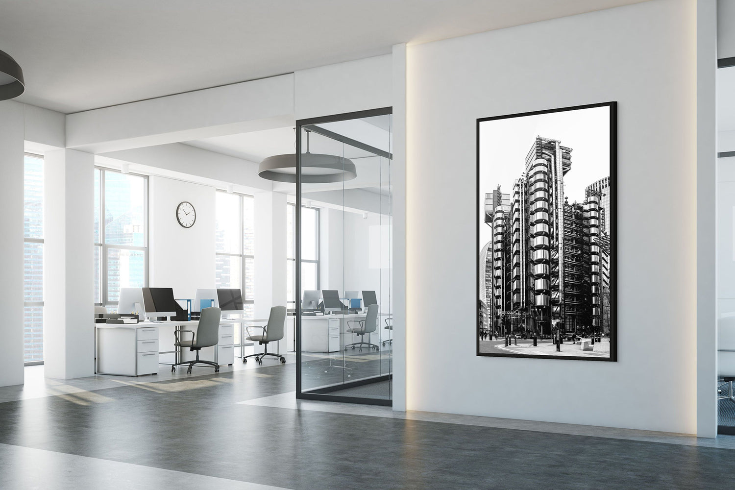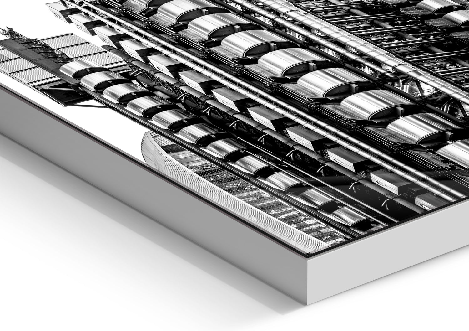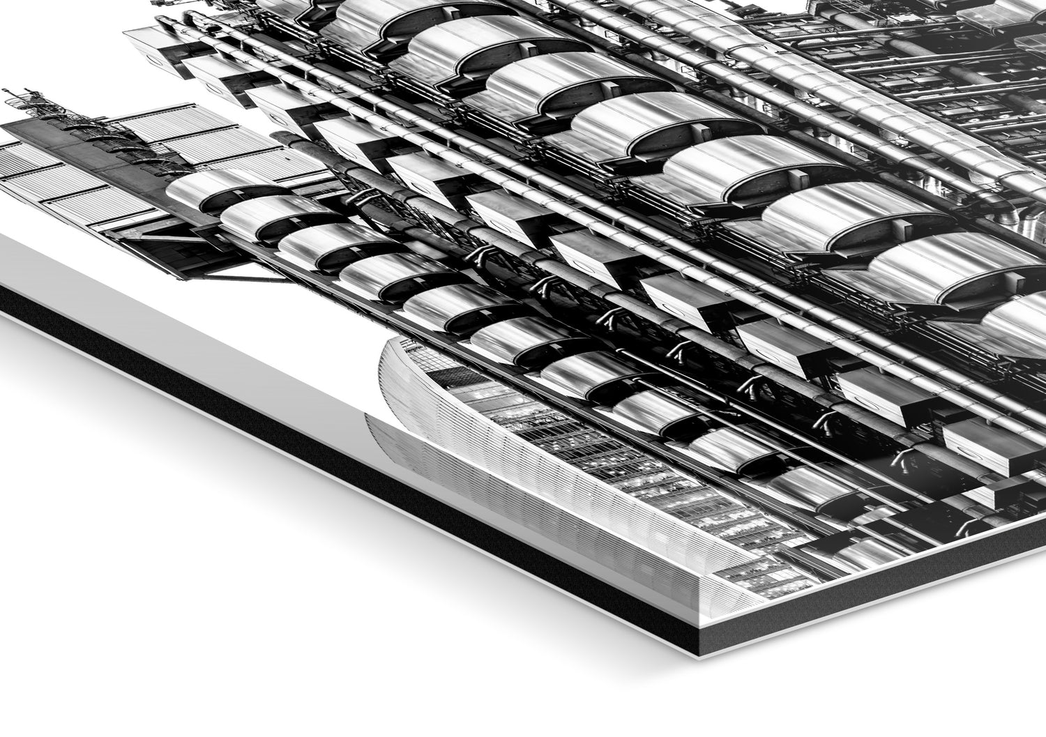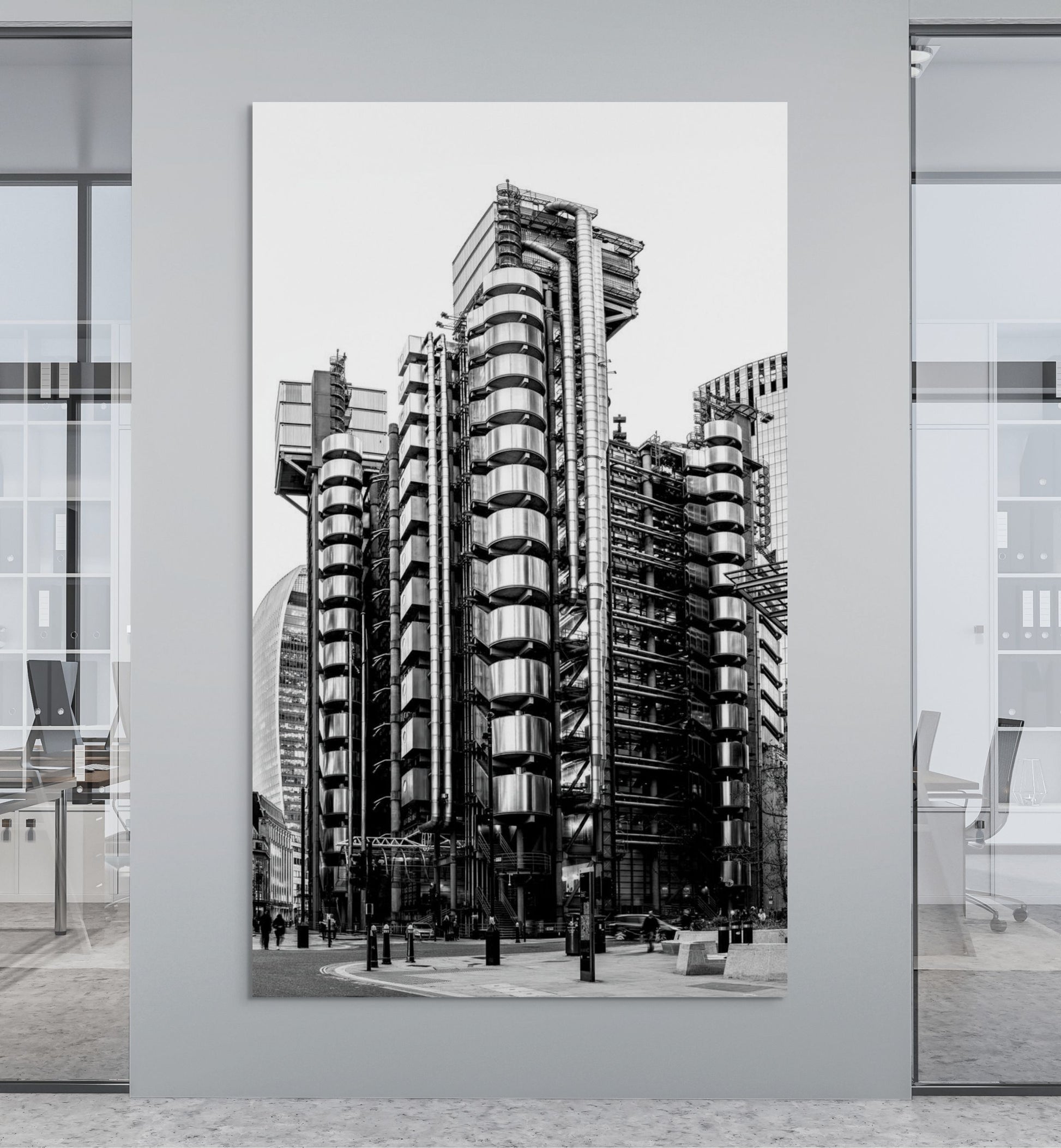 Capturing the full, vertical length of the Lloyds Building in an architectural photo had it's challenges as it is surrounded by many tall buildings and only one location where one had unobstructed views from a distance of the height and width of the building. I also opted for multiple detailed images that were combined to highlight the intricate details of the building's "inside-out" look. This black & white photo enhances the metallic look of the building's exterior.
