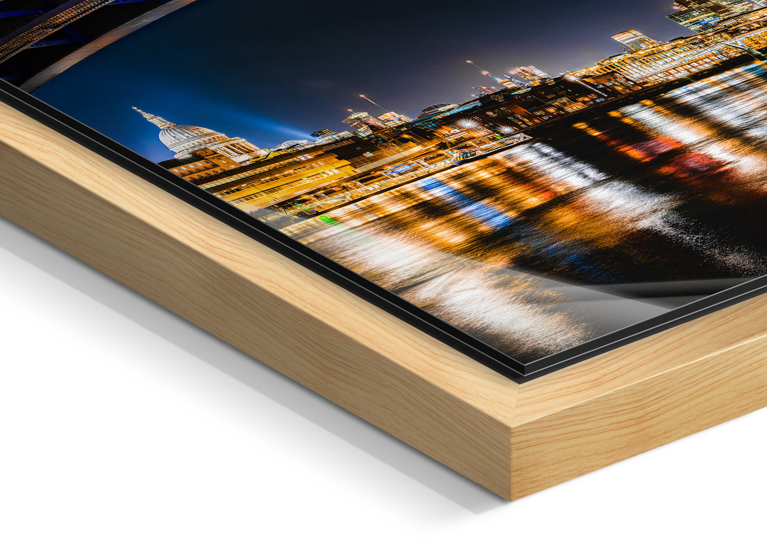 A gap between the image and the solid wood frame creates the impression the picture is levitating