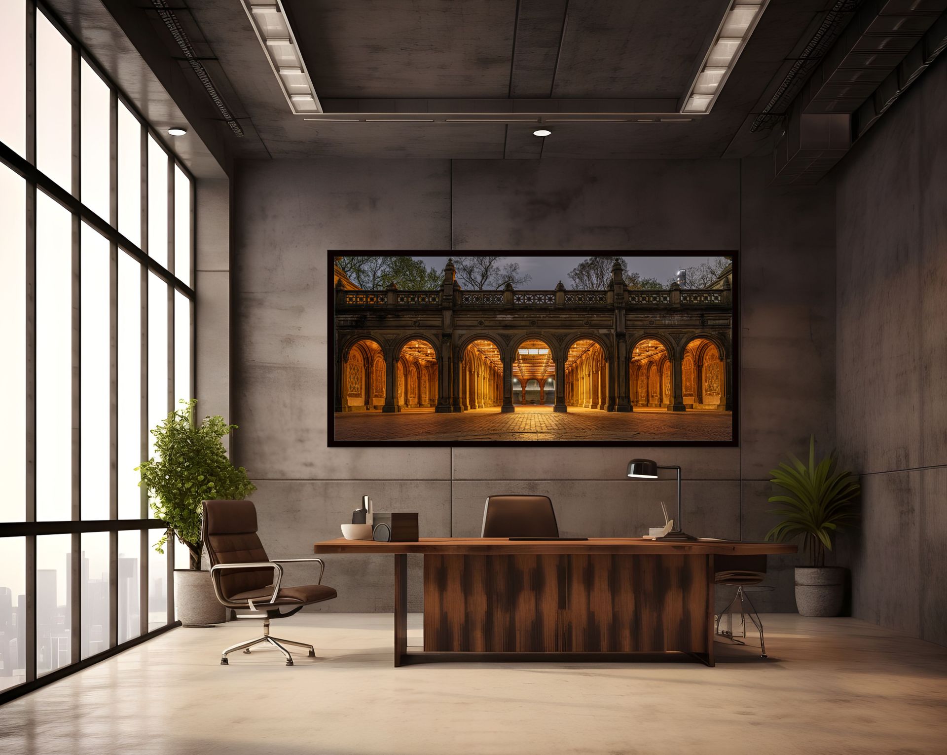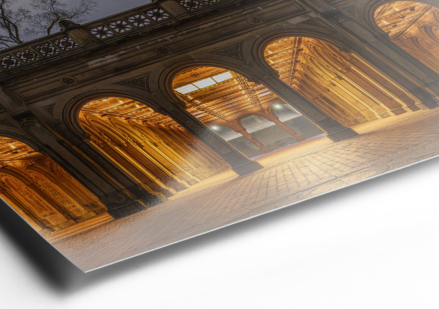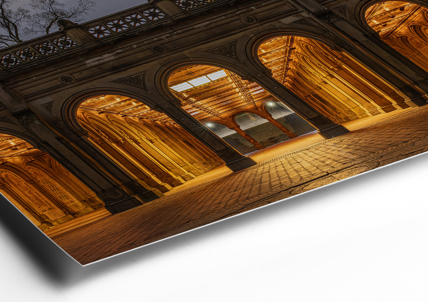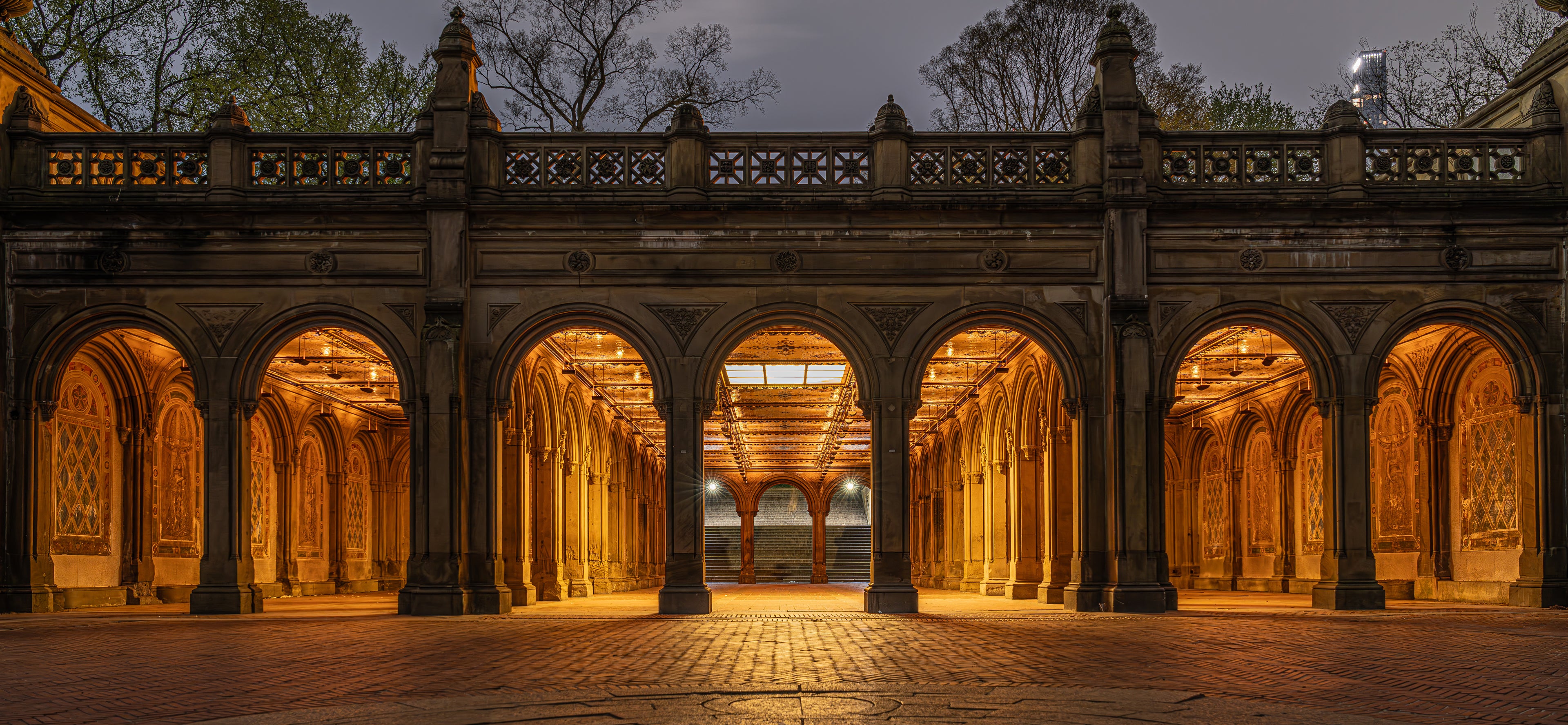 An intimate look into Bethesda Terrace at night, this image captures the quiet grandeur of its illuminated arches and intricate stonework. The warm glow transforms the historic arcade into a tranquil sanctuary, inviting contemplation and evoking timeless elegance at the heart of Central Park.
