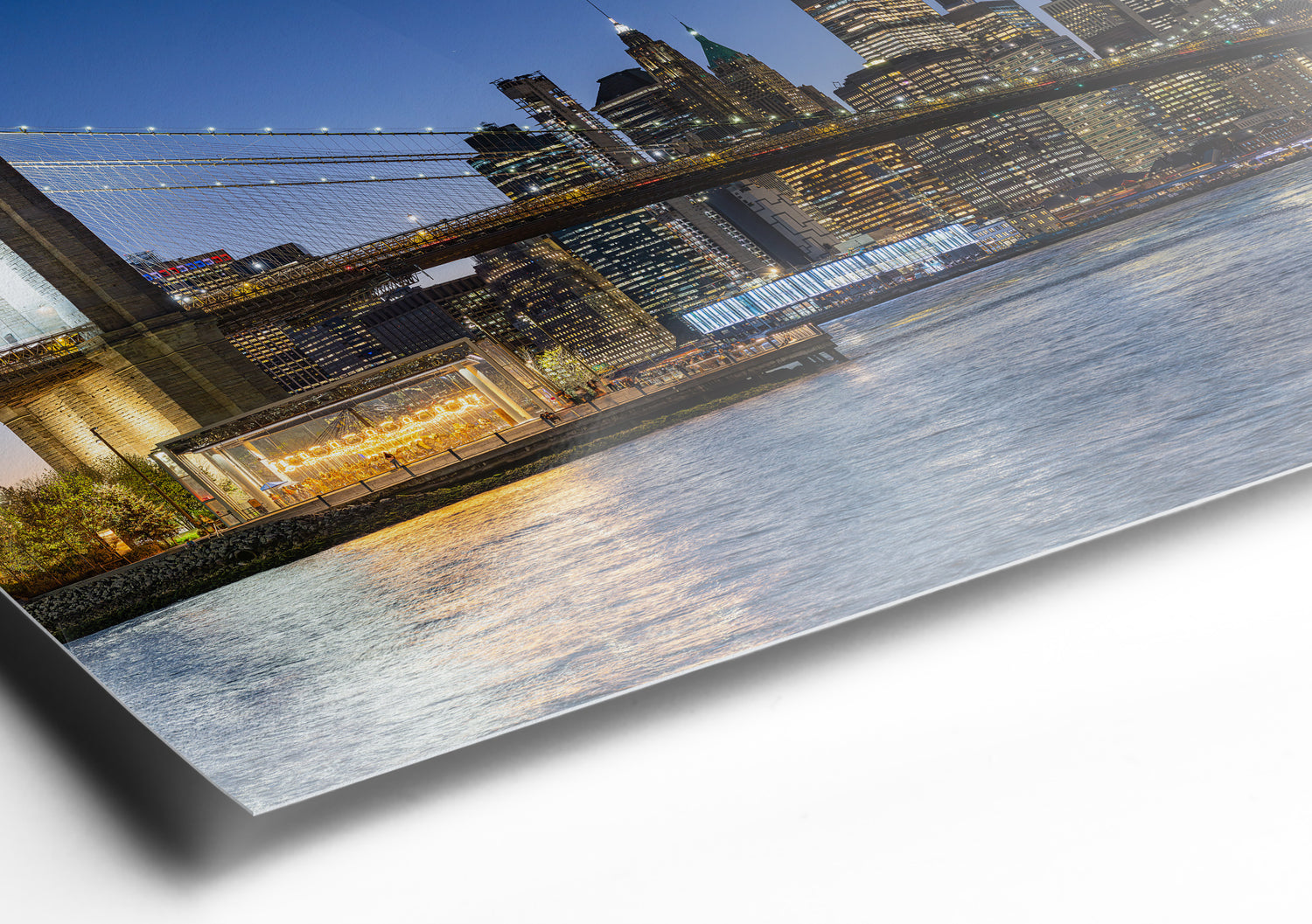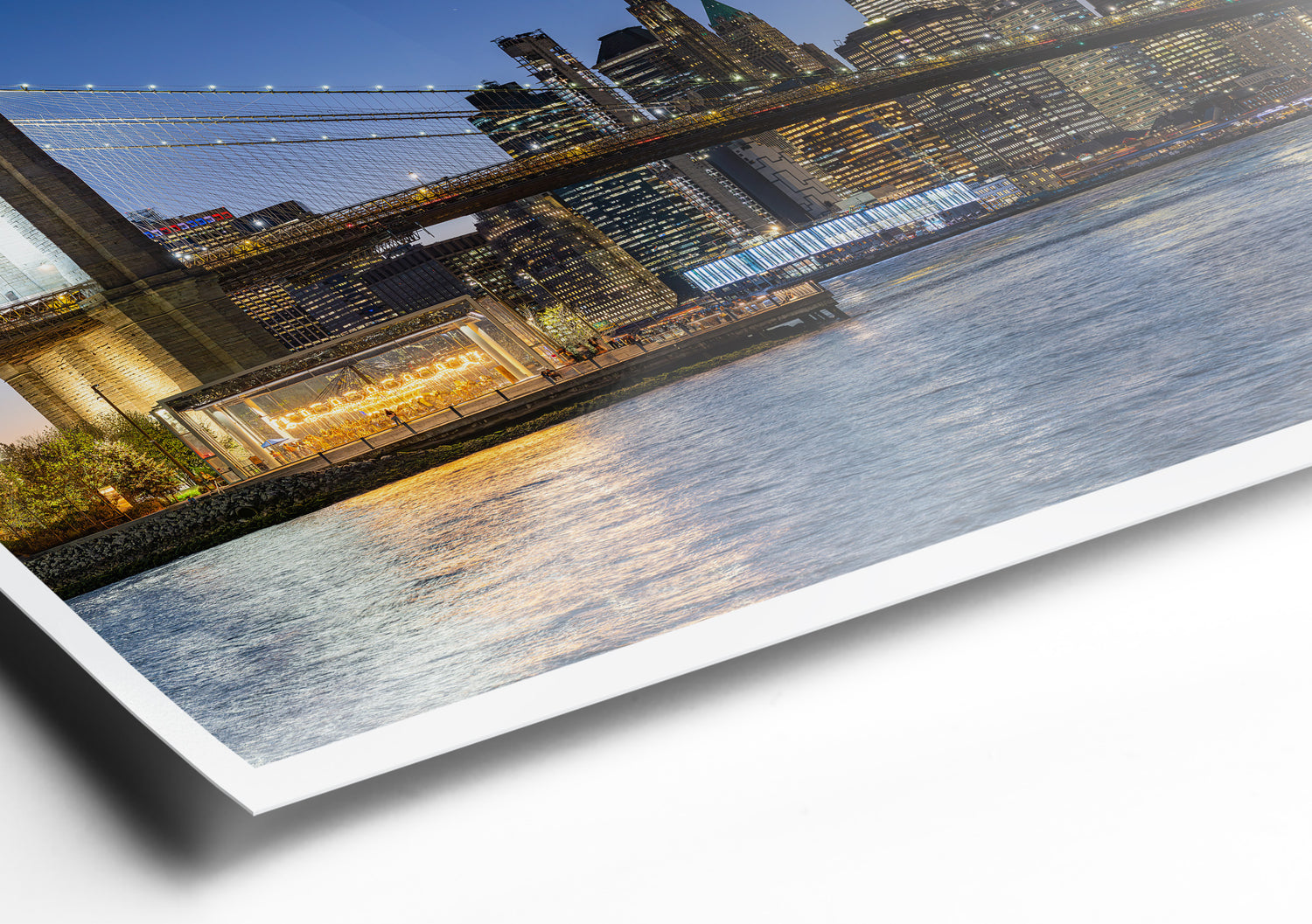 A high-resolution and detailed photo of Lower Manhattan & Brooklyn Bridge from Dumbo in full color as the sun is setting