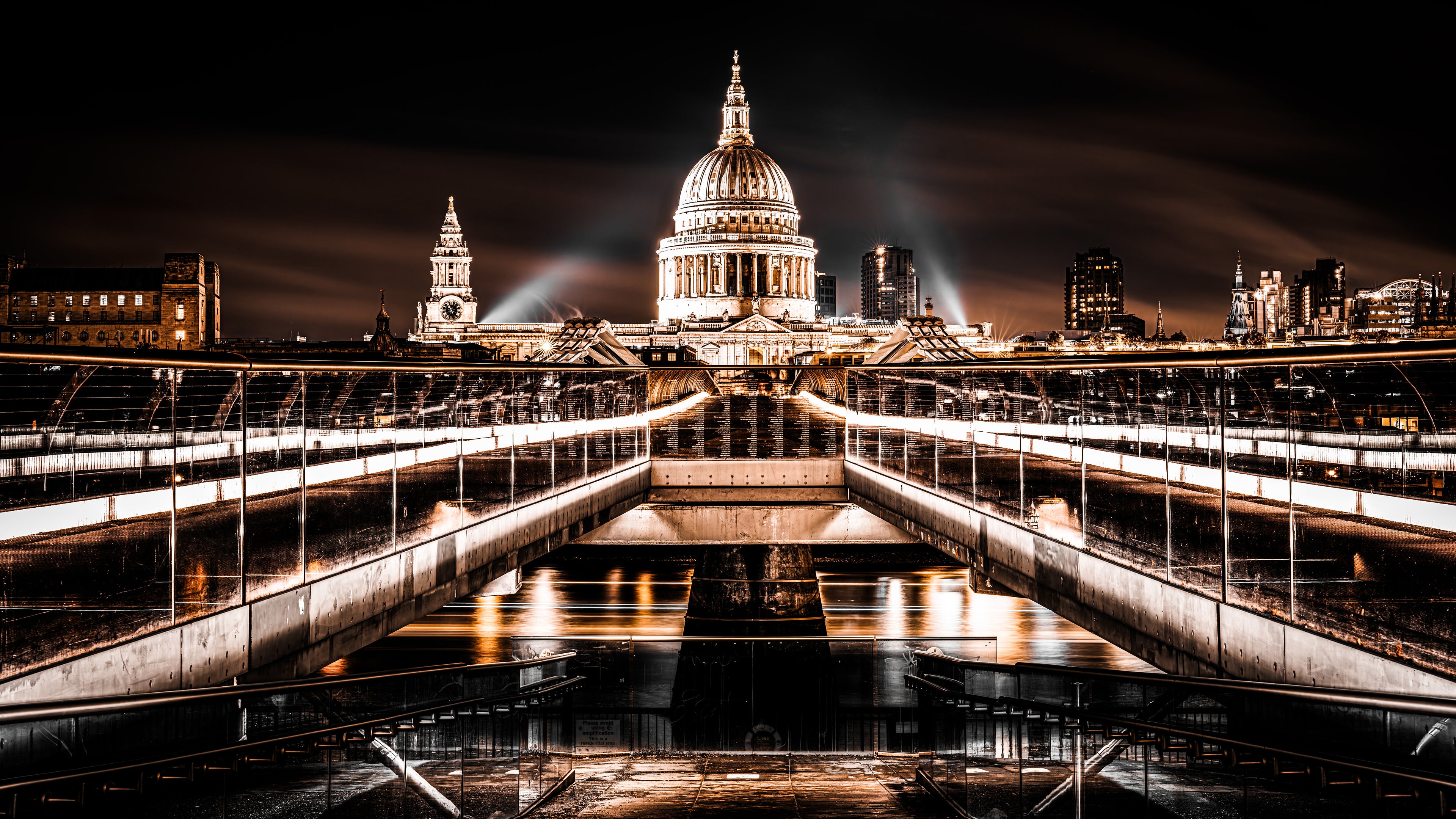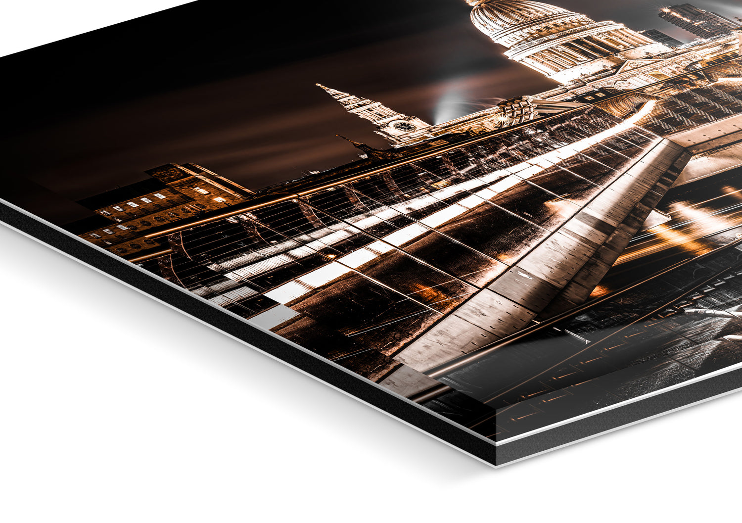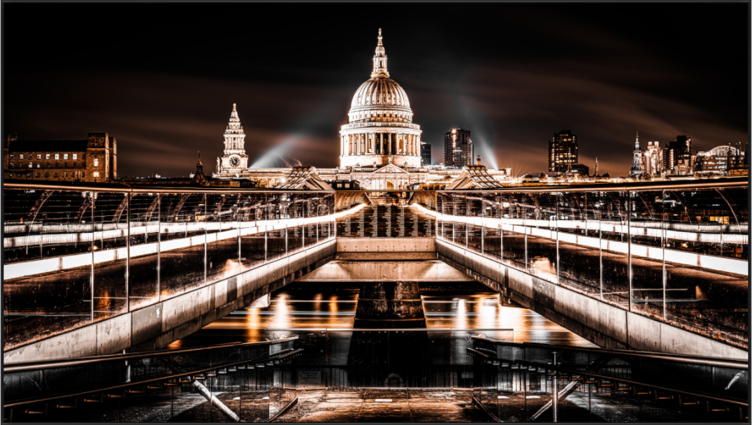 A fine art photograph of the Millennium Bridge leading to St. Paul's Cathedral. Some of the copper color tones appear naturally when taking long exposure night photos across the Millennium Bridge towards St. Paul's. The end result was even more striking than expected and provided a different color perspective than what would ordinarily be taken from this vantage point.