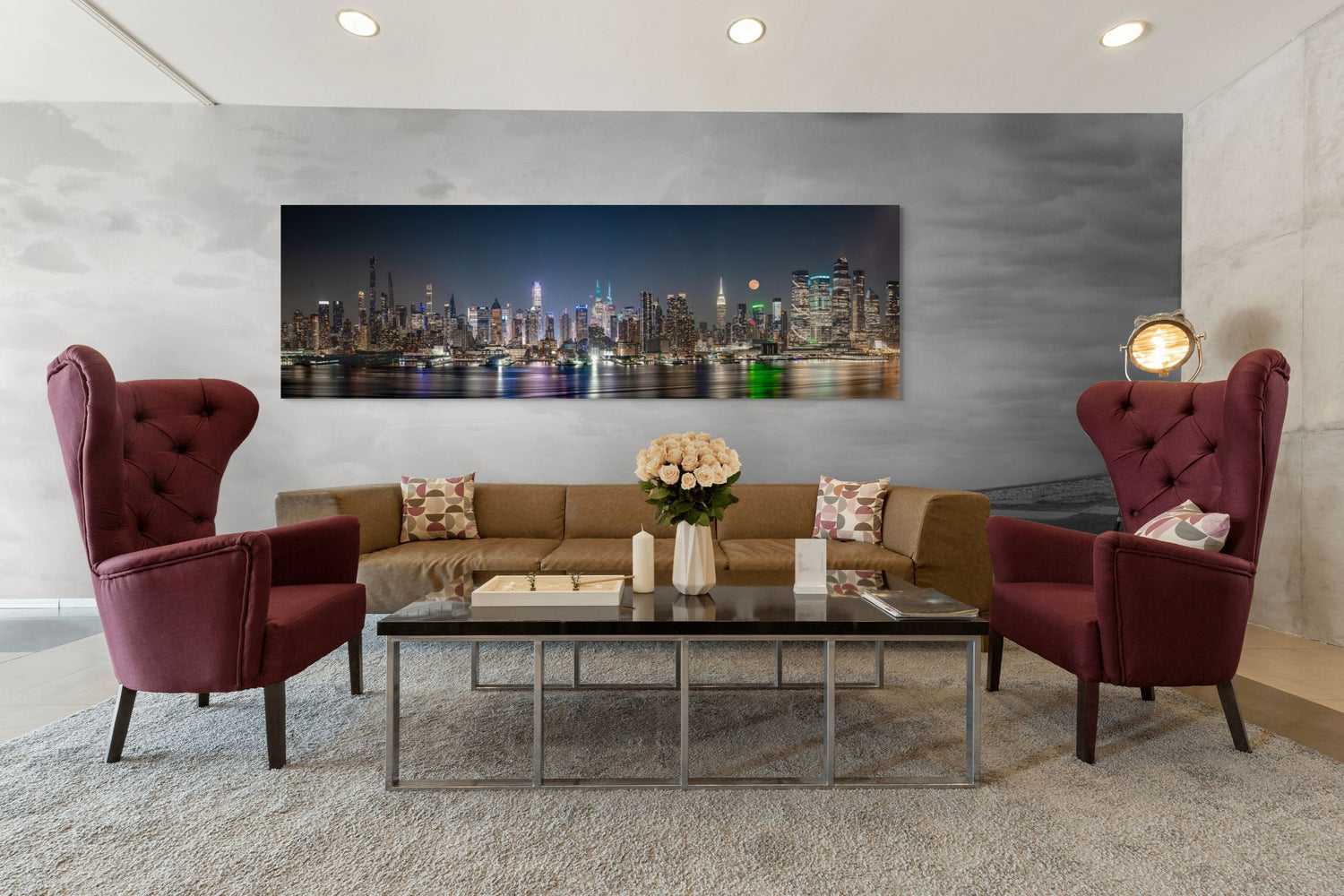 A high-resolution and highly detailed composite image of the New York City skyline from Jersey City in vibrant color. This photo consists of multiple long exposures at night and captured the full strawberry moon during June 2025