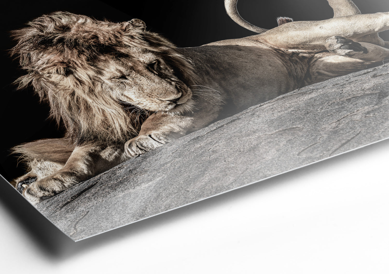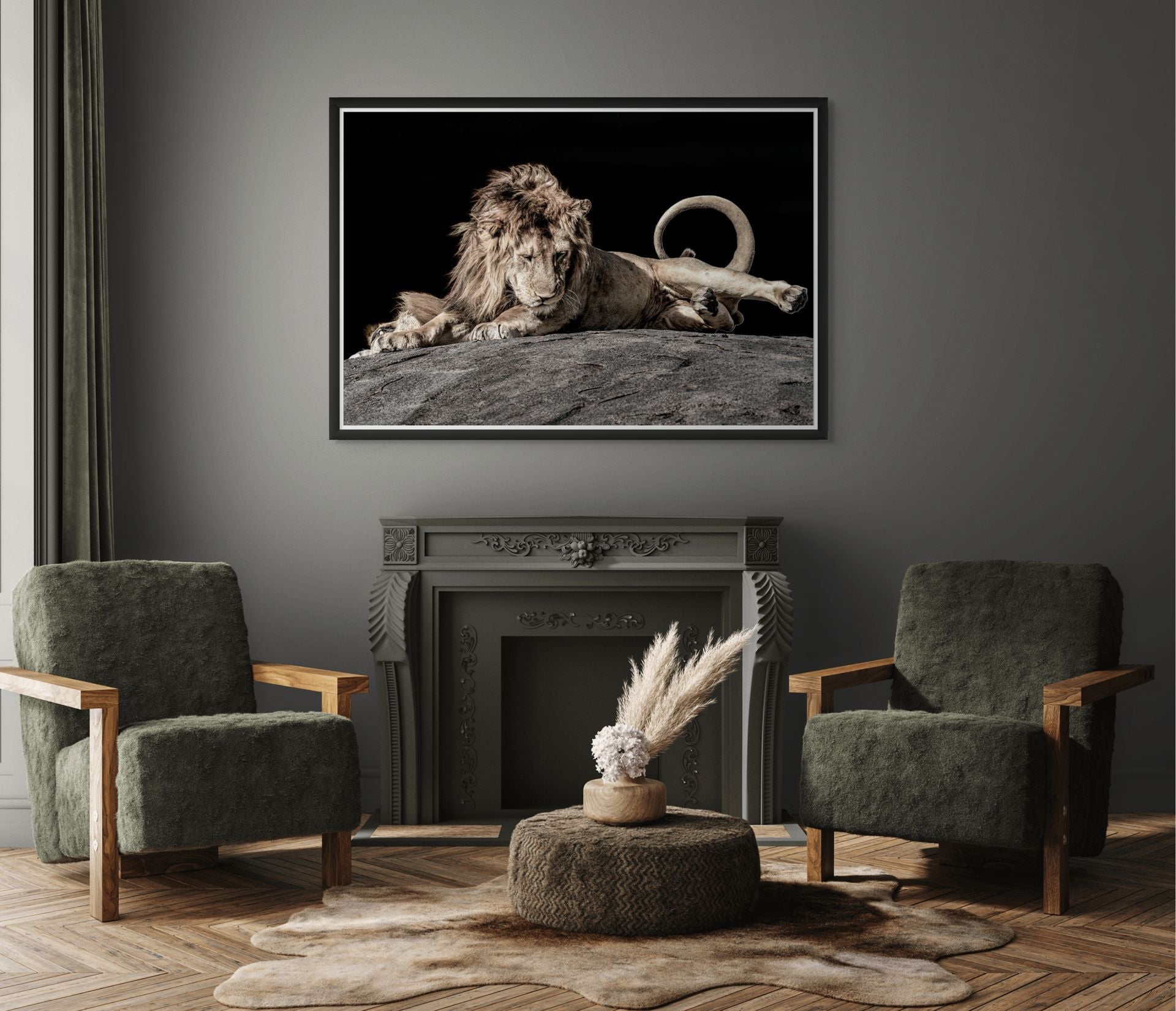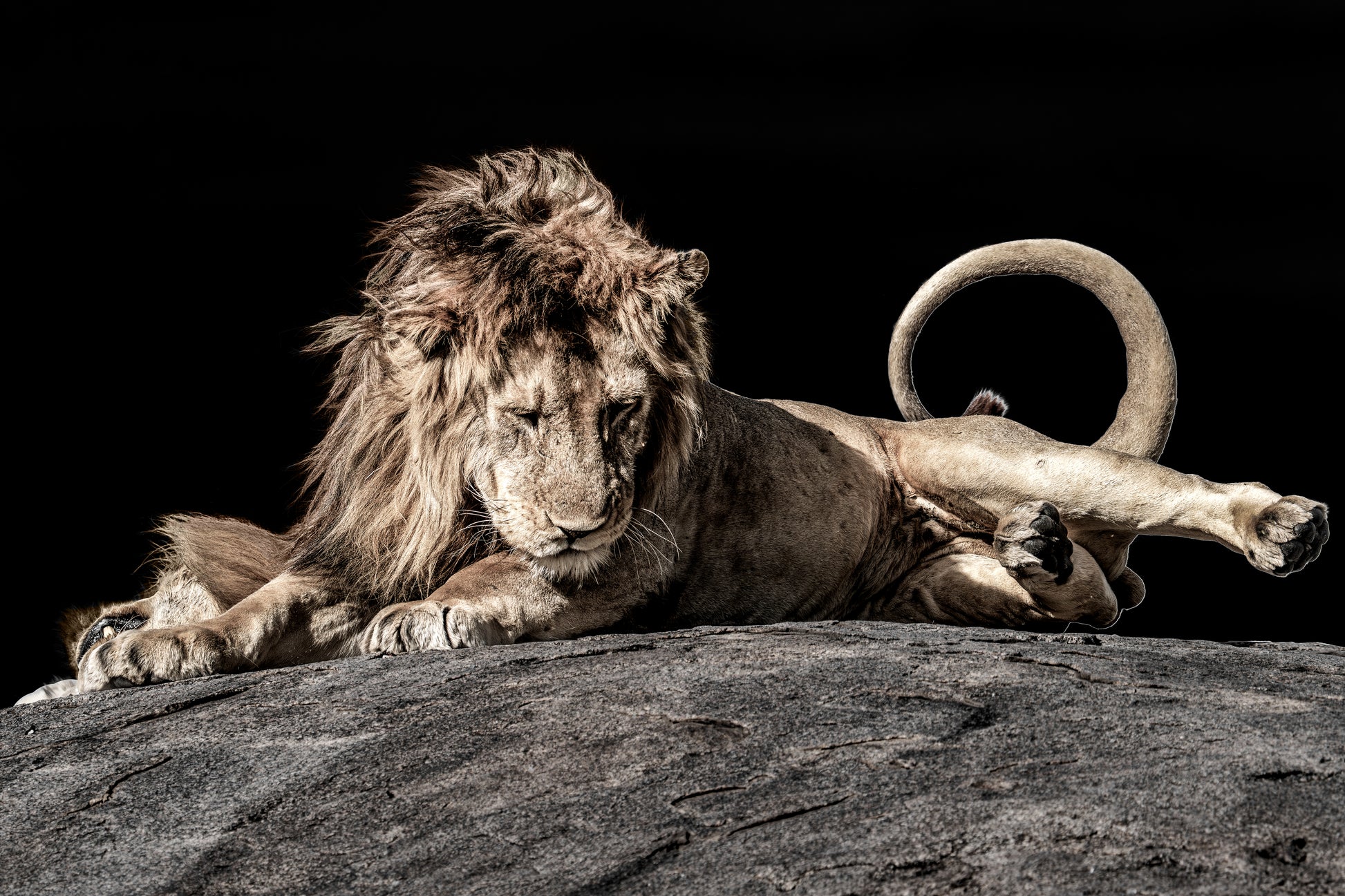 When Kings Dream captures a majestic male lion perched on a rocky outcrop in Serengeti National Park, his powerful body stretched in a languid, almost sculptural pose as he sleeps. Against a stark black background, his rugged mane and gracefully curled tail stand out in striking detail. The photograph evokes the idea of the lion lost in dreams - an intimate moment that reveals not just his raw strength, but the vulnerability and mystery of a ruler at rest.