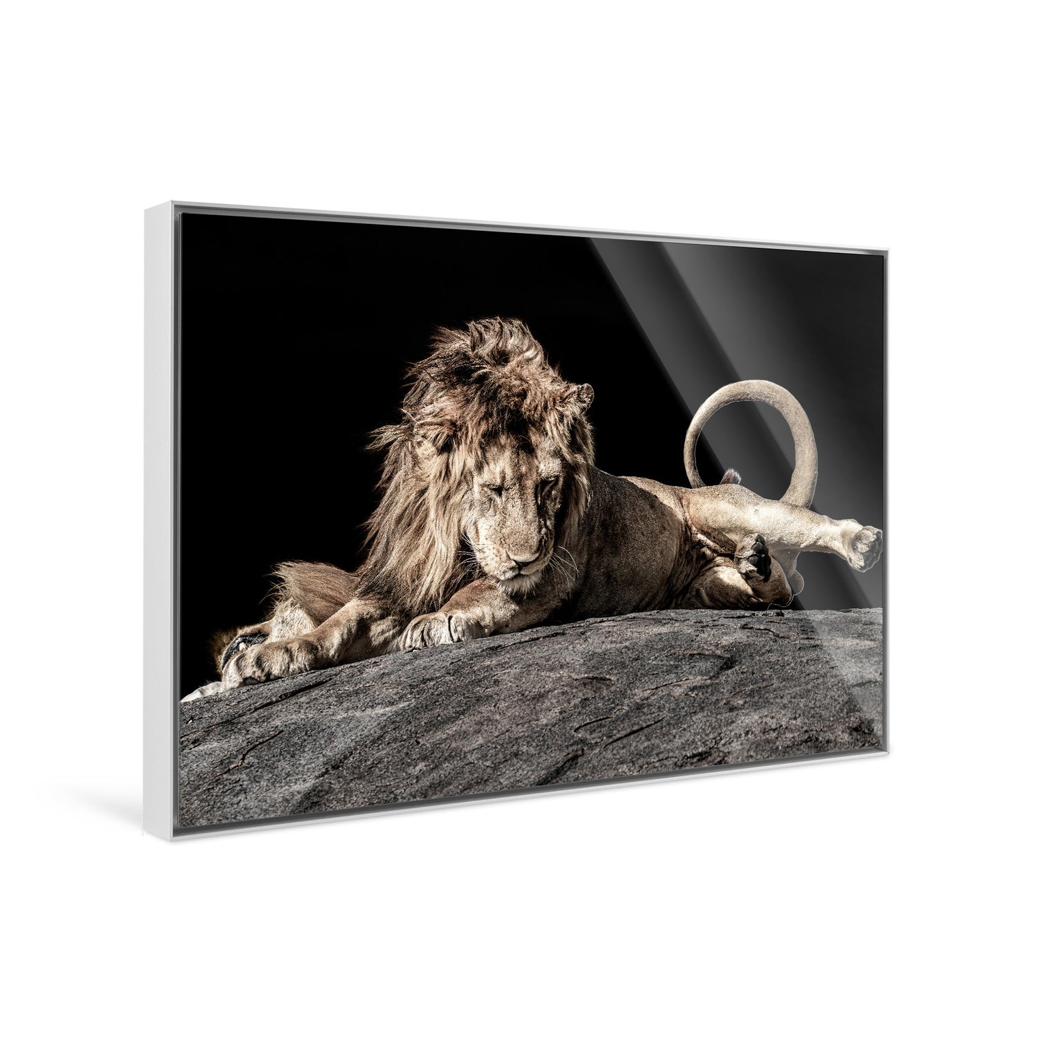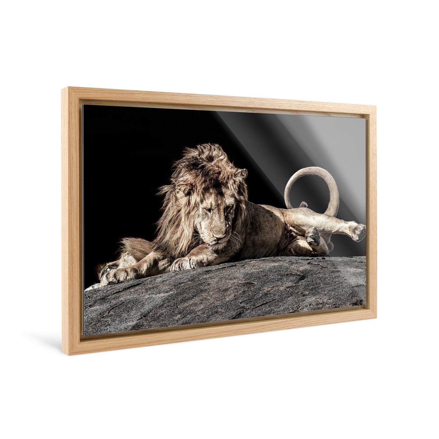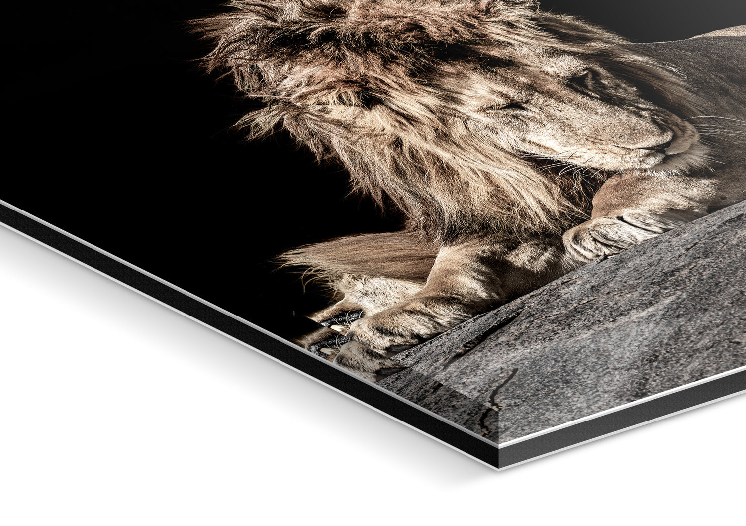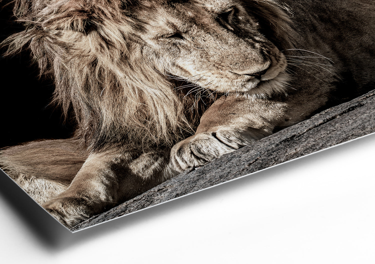 When Kings Dream captures a majestic male lion perched on a rocky outcrop in Serengeti National Park, his powerful body stretched in a languid, almost sculptural pose as he sleeps. Against a stark black background, his rugged mane and gracefully curled tail stand out in striking detail. The photograph evokes the idea of the lion lost in dreams - an intimate moment that reveals not just his raw strength, but the vulnerability and mystery of a ruler at rest.