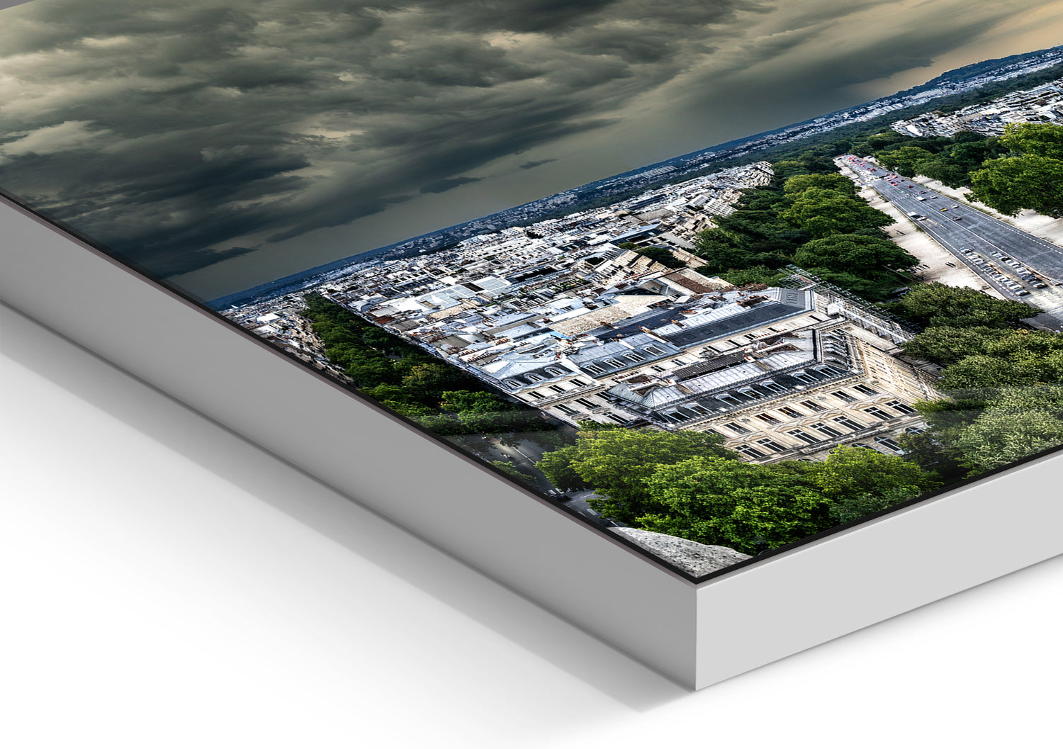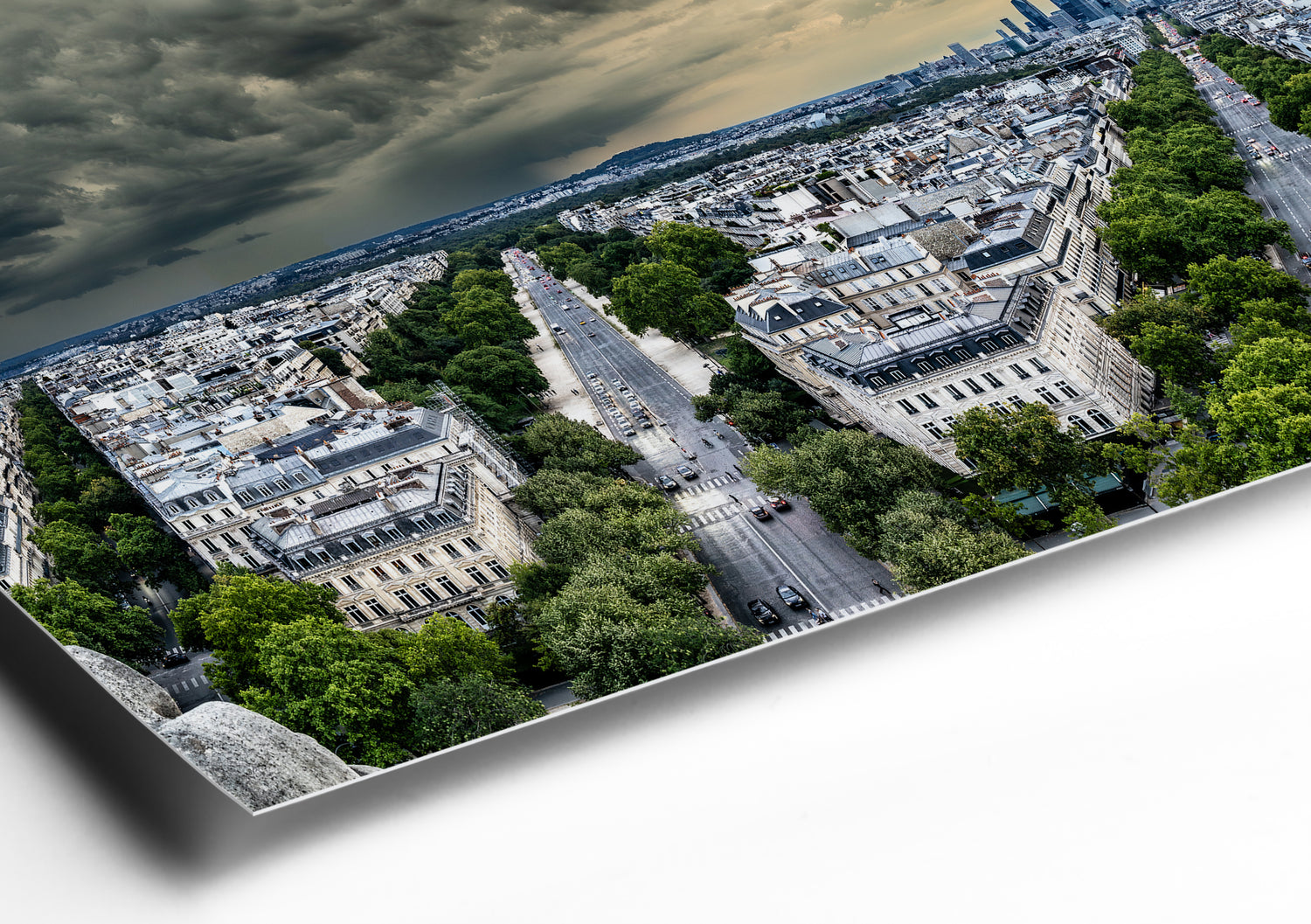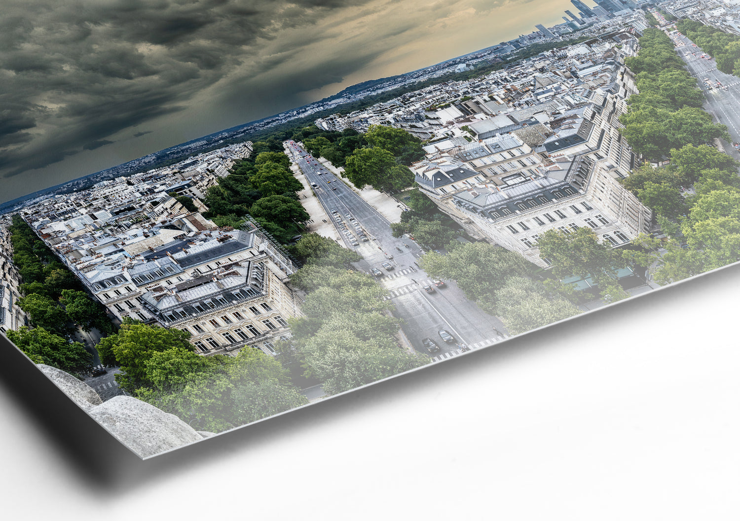 Storm-lit clouds gather over Paris as the boulevards draw the eye toward the modern horizon of La Defense.