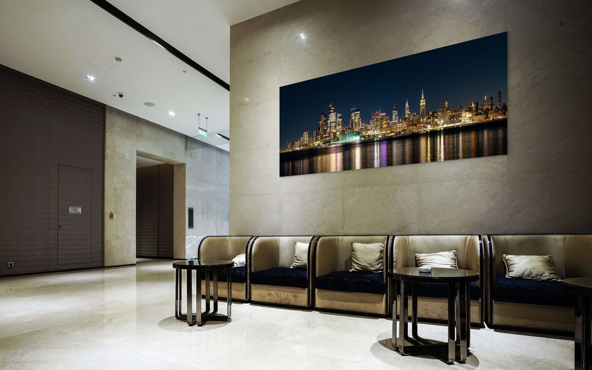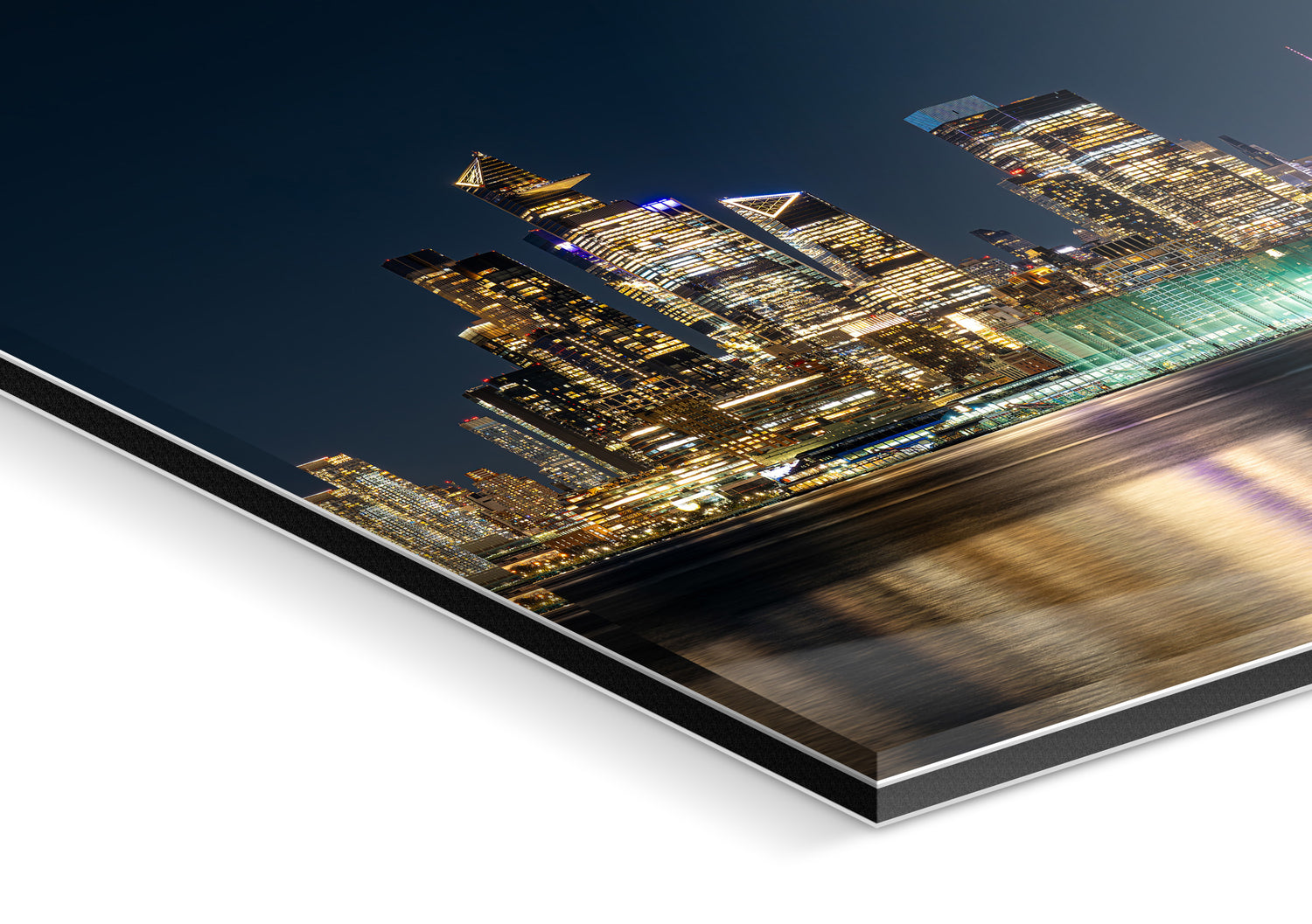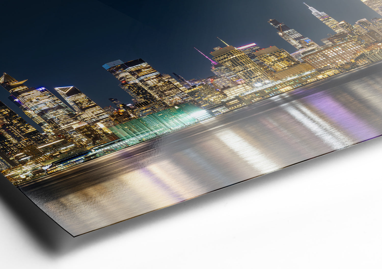 A long exposure and high-resolution composite panoramic image in color under Acrylic glass of the Manhattan skyline from Jersey City